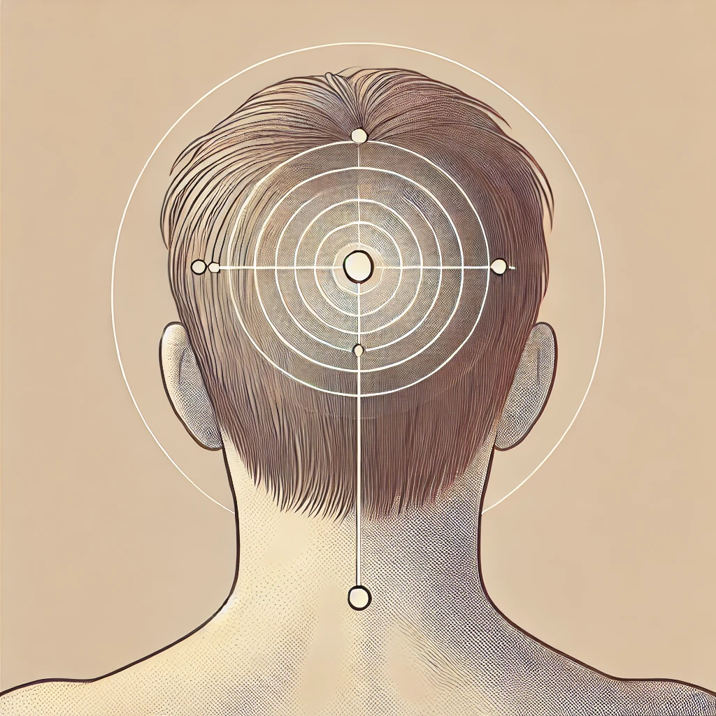 위치: 머리 정수리 중앙에 위치하며, 양쪽 귀 끝을 연결하는 선과 코에서 머리 위로 올라가는 선이 만나는 지점입니다.